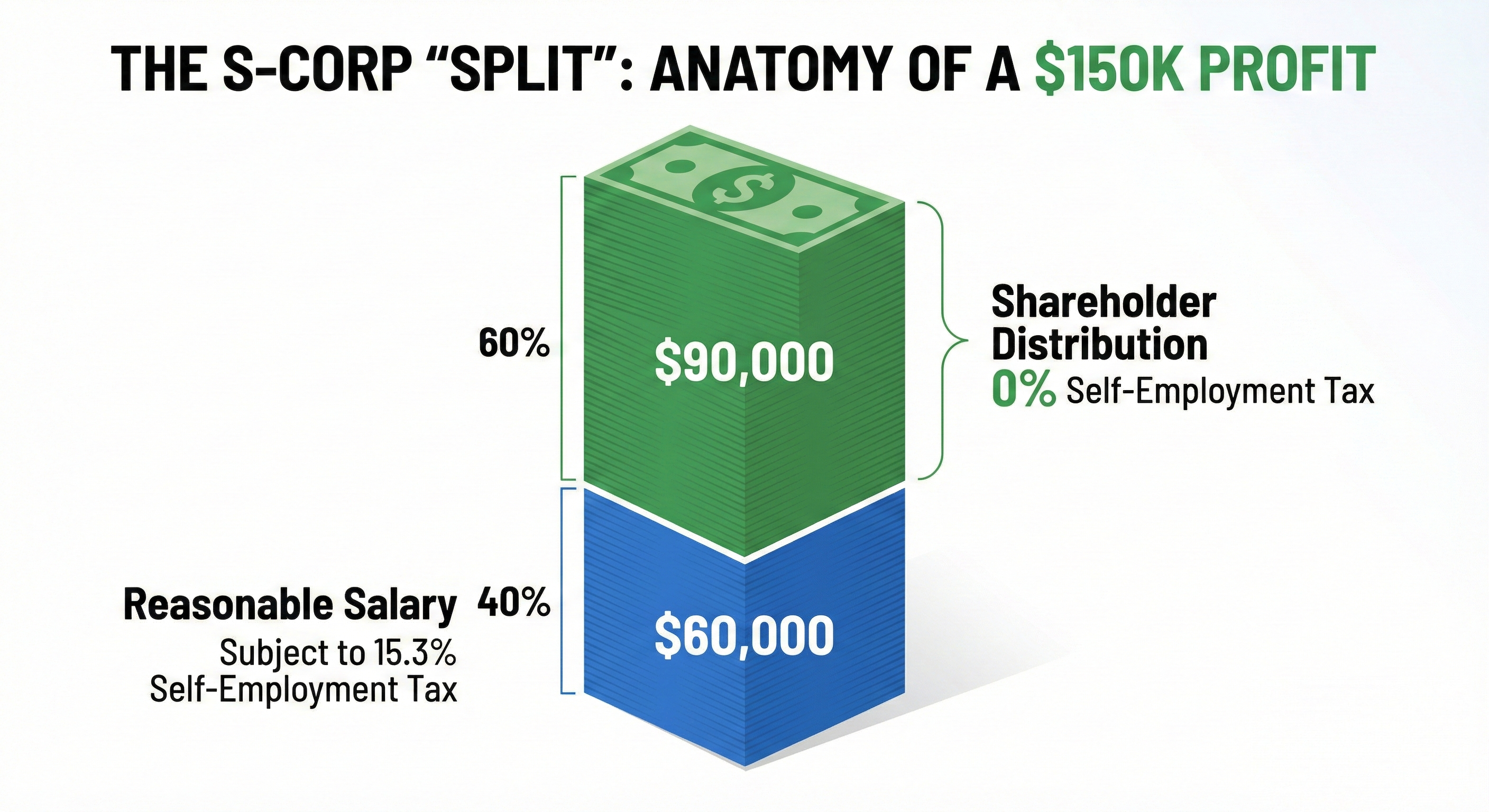 - Profit $80,000 – $150,000: This is the ideal range for the 40/60 or 50/50 rule. For example, at $150,000 profit, paying yourself a $60,000 salary is typically defensible for most professional services. This structure allows you to take the remaining $90,000 as a distribution, saving you approximately $10,000 to $12,000 in taxes compared to a standard LLC.