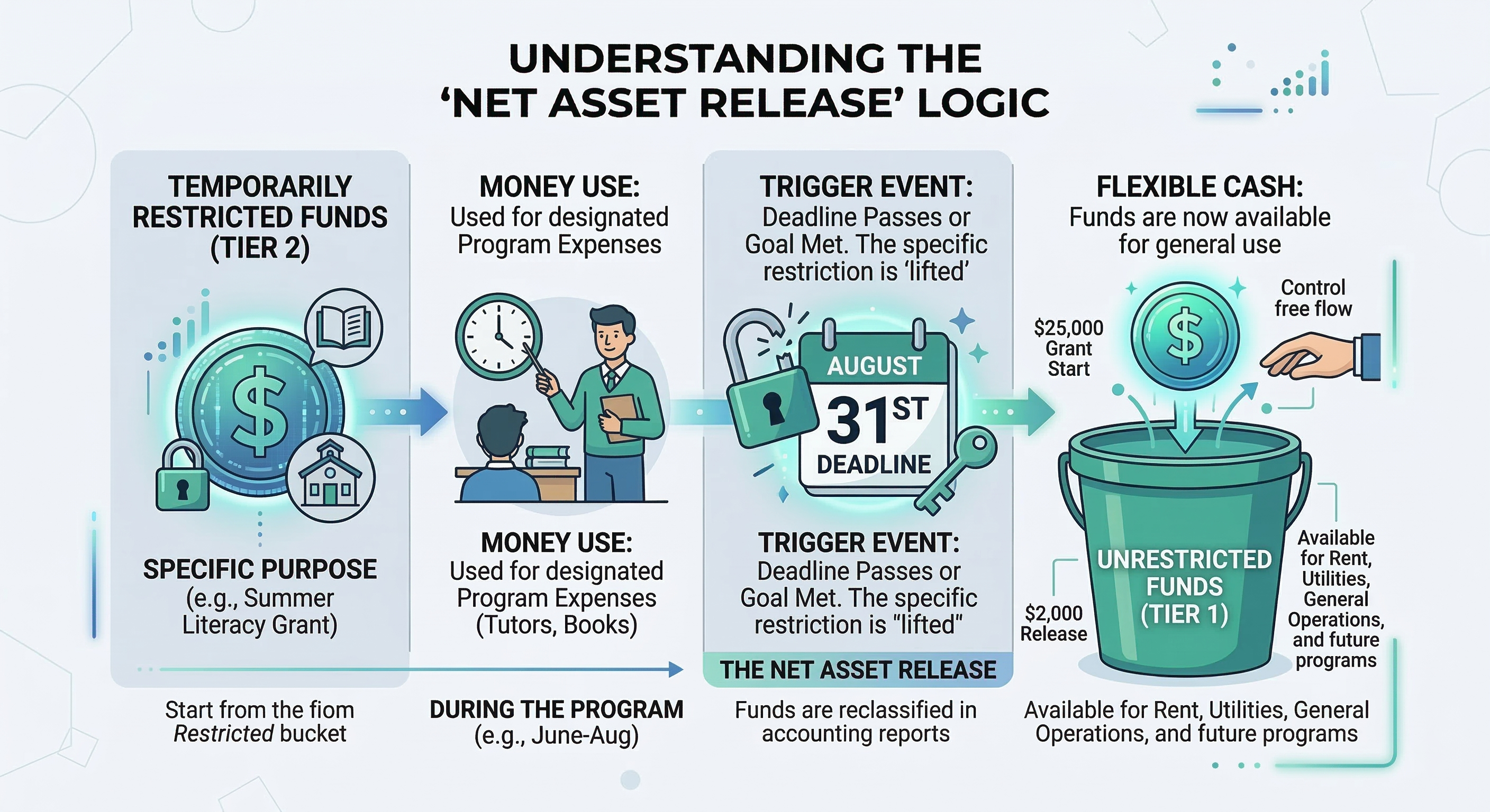 One of the most overlooked steps is the formal release of funds. This is the process of moving money from your Restricted pool to your Unrestricted pool once you have met the donor’s requirements.